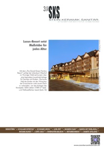 2025 www.steinkeramiksanitaer.de Ausgabe 3 – III. Quartal 2025 38. Jahrgang G10425 Segeltörn 7 + Schularchitektur 8 + schwarz-weiss 10 + Uhr-zeit 15 + Bunker-flair 16 + Baden mit papa-Moll 22 Mosaik-Kunst 26 + Expo 2025 29 + Rheinufer-Balkon 32 + refurbishment 34 + smarte spülung 35 3 Foto: The Grand Green Familux Luxus-Resort setzt Maßstäbe für jedes Alter Mit dem „The Grand Green Familux Resort“ verfügt der Urlaubsort Oberhof im Thüringer Wald seit kurzem über eine besondere Luxushotel-Anlage für Familien mit Kindern. Die bunte Welt der Kinder mit den Wünschen der Erwachsenen unter einem Dach zu verknüpfen, war das Anliegen des Konzeptes. Dafür stehen 3 000 m² Spiel- und Wellnessflächen bereit (Seite 18)