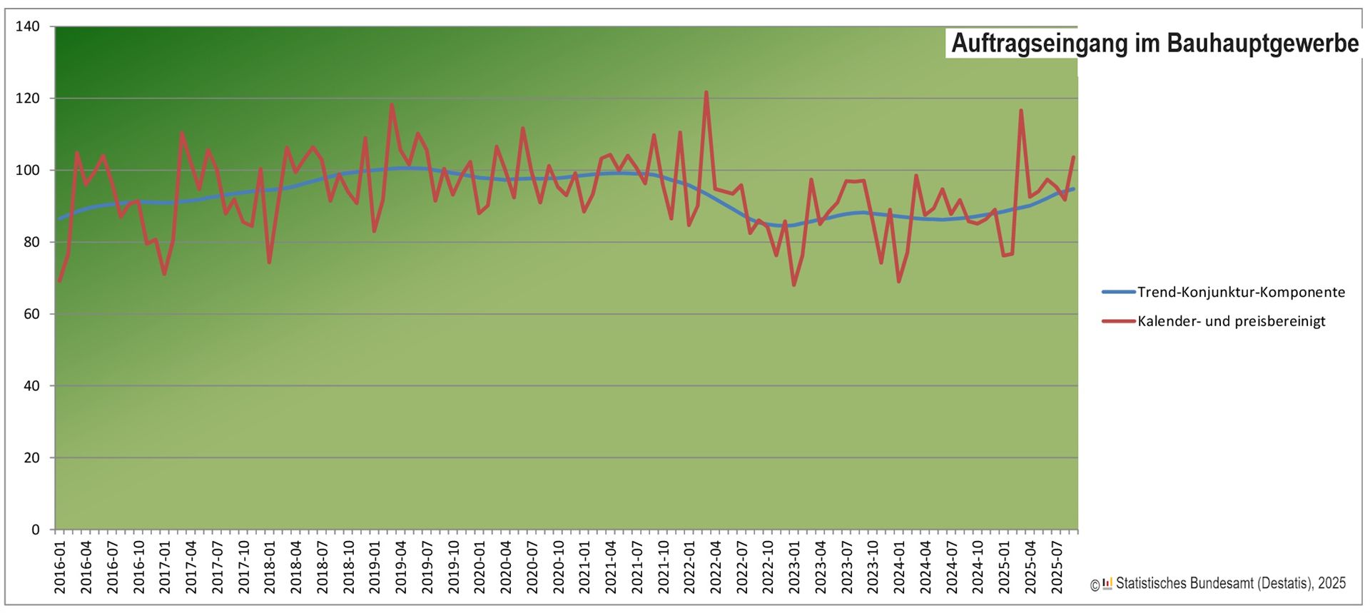 Im Vergleich zum Vorjahresmonat September 2024 stieg der reale, kalenderbereinigte Auftragseingang im Bauhauptgewerbe im September 2025 um 20,7 Prozent. Allerdings sei dieser Anstieg unter anderem auf den Einfluss von Großaufträgen im September 2025 zurückzuführen sowie darauf, dass der Wert im Vorjahresmonat im Vergleich der letzten drei Jahre relativ niedrig war.