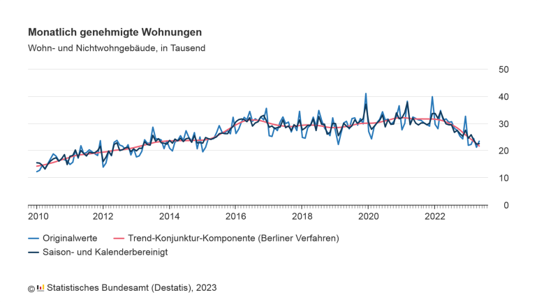 So wurden im April 2023 im Vergleich zum April 2022 31,9 Prozent weniger Wohnungen genehmigt, während es im März 2023 im Vergleich zu März 2022 29,6 Prozent weniger Genehmigungen waren. Betroffen waren sowohl die Baugenehmigungen für Wohnungen in neuen Gebäuden als auch für neue Wohnungen in bestehenden Gebäuden.