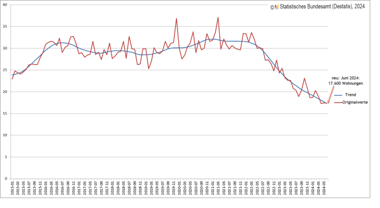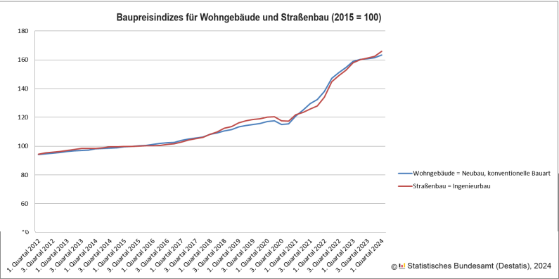 Dabei war es überaus kontraproduktiv, dass das Bauen gleichzeitig teurer wurde. So seien die Preise für den Neubau konventionell gefertigter Wohngebäude in Deutschland laut Bundesamt im Februar 2024 um 2,8 Prozent gegenüber Februar 2023 gestiegen. Im November 2023, dem vorherigen Berichtsmonat der Statistiker, waren die Preise im Vorjahresvergleich sogar um 4,3 Prozent gestiegen. Nur unverbesserliche Optimisten dürften einen Trend wittern, nachdem das Statistische Bundesamt den Berichtszeitraum auf den Mai 2024 aktualisiert hat. Danach sind die Preise gegenüber Mai 2023 um 2,7% gestiegen. Aber selbst von Februar 2024 bis Mai 2024 erkannten die Statistiker erneut einen Preisanstieg: +0,7 Prozent.