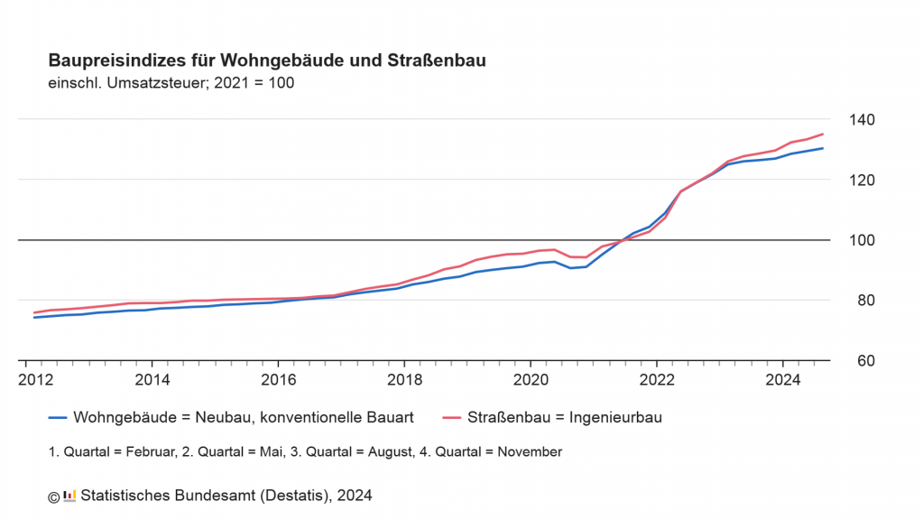 Nicht genug, dass die Baukonjunktur weiterhin lahmt und Bauaufträge immer häufiger auf die lange Bank geschoben werden. Auch die Baupreise sorgen für weiter für Unlust bei den Bauwilligen. So hat das Statistische Bundesamt ermittelt, dass die Preise für den Neubau konventionell gefertigter Wohngebäude in Deutschland im August 2024 um 3,1 Prozent gegenüber August 2023 gestiegen sind. Im Mai 2024, dem vorherigen Berichtsmonat der Statistik, hatte der Preisanstieg im Vorjahresvergleich noch 2,7 Prozent betragen. Nur drei Monate später musste für das Bauen bereits 0,7 Prozent mehr bezahlt werden.