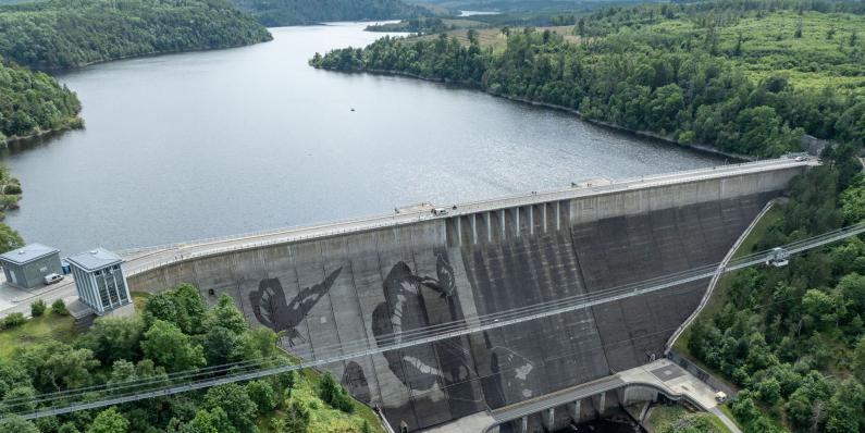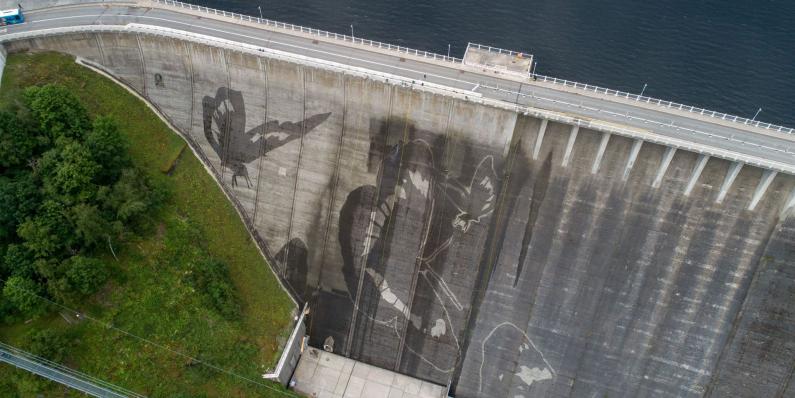 Frisch und in voller Pracht aber locken Dauvens Kunstwerke auf der Staumauer der Rappbodetalsperre im Harz die Besucher an. Sie ist Deutschlands höchste Trinkwassertalsperre 460 Meter lang und 75 Meter hoch, und inzwischen Dauvens siebte „Staumauer-Leinwand“. Möglichweise ist sie auch sein Publikum wirksamstes Werk. Denn die Talsperre ist eine Touristenattraktion. Von der Hängebrücke davor springen Bungee-Jumper herunter, im Minutentakt sirren Touristen an einer Zipline hängend über mehr als 450 Meter Länge in die Tiefe, immer der Wasseroberfläche zu.