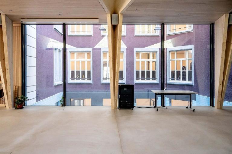 Zur Erfüllung dieser Spezifikationen dient auch die voll integrierte Skulptur der Sitzbank in Form eines extendierten Startblocks. Der neu gewonnene Raum dient für sämtliche sozialen Zwecke als ungeplanter Bonus, als Pausen- und Rückzugsraum, für außerschulische Zwecke und als Ausstellungs- und Spielraum für Ideenwettbewerbe. Er schenke der Schule als Lernort einen neuen Horizont und gibt den umliegenden Räumen eine Aussicht aufs Innere, so das Credo von Camillo und Giacomo Paravicini.