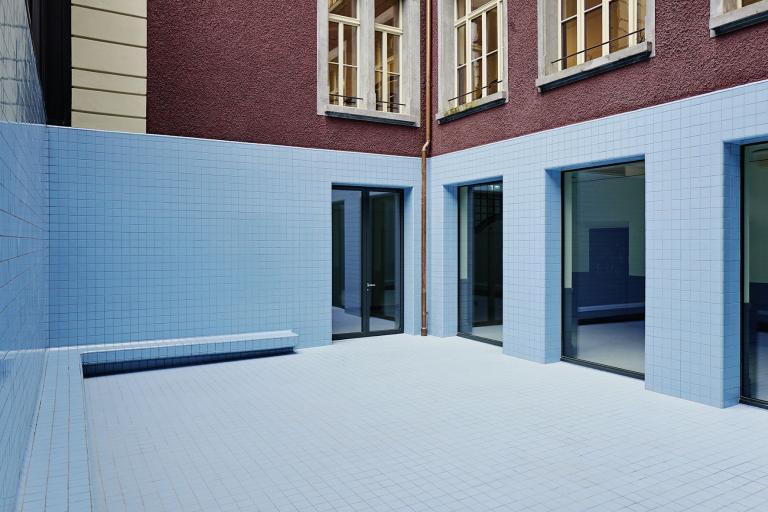 Die simple Umwandlung eines kargen Raumes in ein multifunktionales „Schwimmbecken der Ideen“ gibt dem ehrwürdigen Schulhaus ein zeitgemäßes Markenzeichen, welches in das gesamte Schulhaus ausstrahlt, so die Idee der Künstler. Der warme blaue Farbton soll die Anwesenheit von Wasser suggerieren und das kindliche Denken beflügeln. Je nach Fenstereinblick erinnert der Innenhof auch an ein Aquarium.