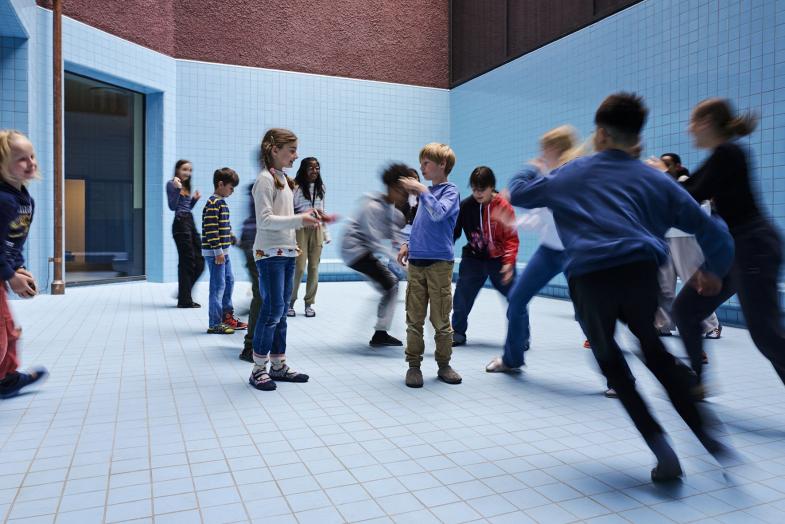 Die kleinformatigen keramischen Fliesen sollen zugleich Symbole des Schulalltags sein. Denn Quadrate oder Rechenkästchen begleiten ihn in allen Disziplinen: Sie teilen den freien Raum in Funktions- oder Spielfelder, dienen als Hilfe beim Zeichnen und Verstehen, lassen sich zählen, teilen und potenzieren. Seit der hellenistischen Zeit regen Gitter-Spielbretter zu unzähligen Nutzungen an. Die Fliesen des Schoolpools sind mit abwaschbarer Kreide als Spielflächen zu benutzen; sie lassen sich für Theaterspiele und Vorträge dekorieren und wirken auch ohne Veränderung als spannender Hintergrund und besonderer Raum.