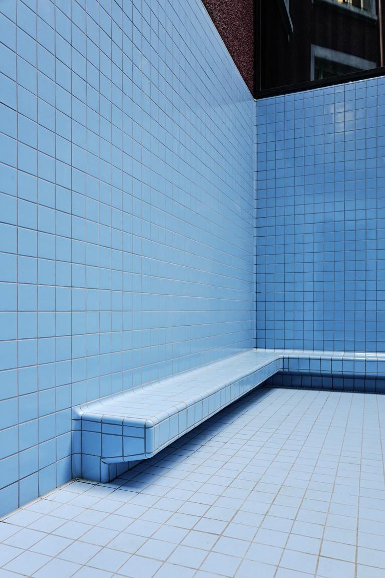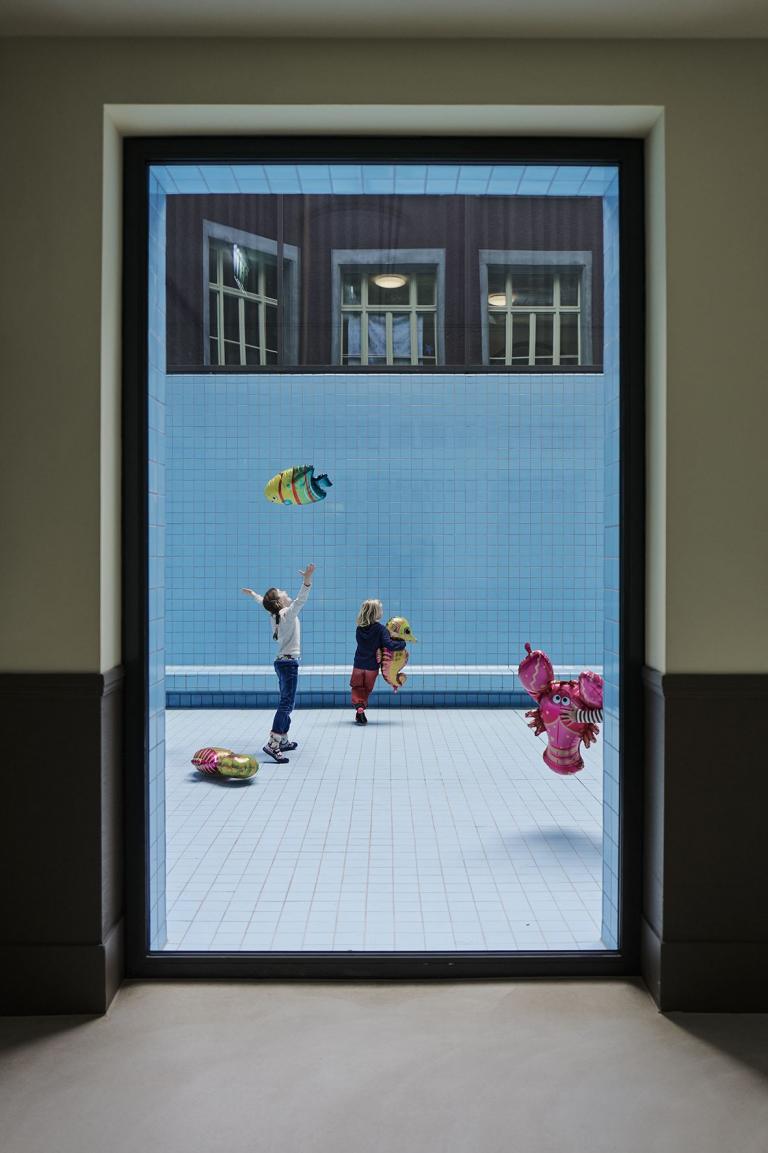 Schwimmbad-Fliesen versprechen Kindern in der Regel Freizeit, Spaß und den Drang, spielerisch das Leben und Überleben zu lernen. Das helle Blau ist eine anregende Farbe, welche das Denken und die Fantasie anregen. Das in allen Sichtbezügen dezent in die Räume schimmernde Blau macht zudem im vorgesehenen Farbenspiel der sanierten Gebäude zwischen Rot und Gelb die Grundfarben komplett.