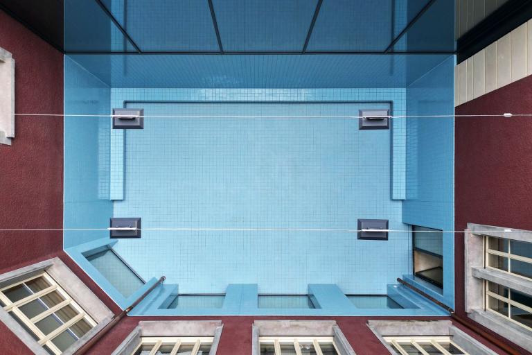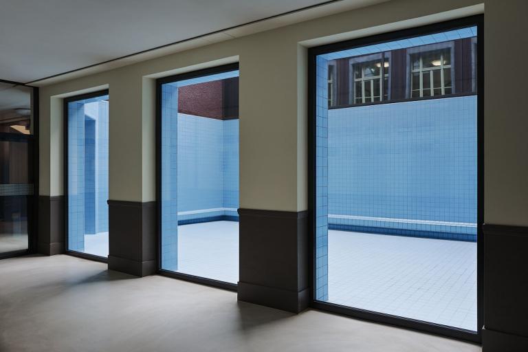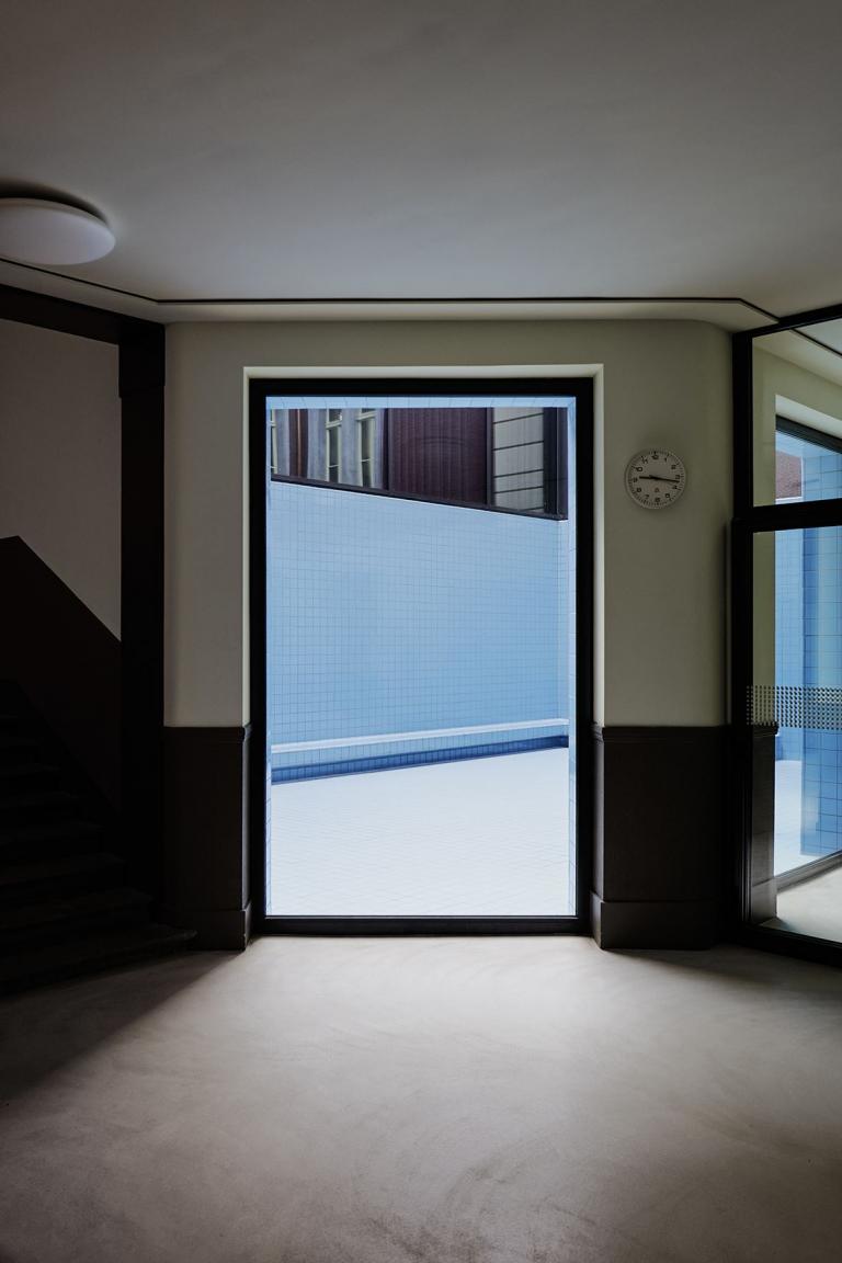 Das von oben einfallende Tageslicht reicht durch die Reflektionswirkung bis in die angrenzenden Räume. Entstanden ist damit eine Sonderfläche für sehr verschiedene spielerische Nutzungsmöglichkeiten. Mit der Assoziation als ein Aquarium gelang es den Künstlern, diesen unbespielten Raum zu sozialisieren: Die Abdichtung des Gebäudes war ohnehin notwendig und die einfachen, üblichen Mittel des Schwimmbad-Baus boten alle notwendigen Lösungen für diese Problemzone. Zugleich entstand mit der Ausgestaltung als Becken ein einzigartiger Raum der Möglichkeiten, ohne dass eine modische ästhetische Überformung aufdringliche Vorgaben für die täglichen Benutzung setzt.