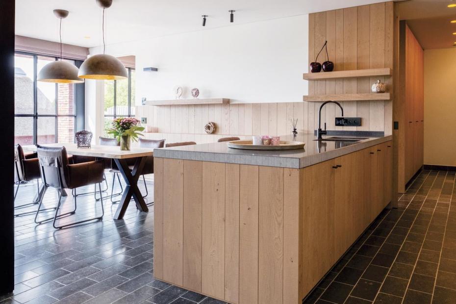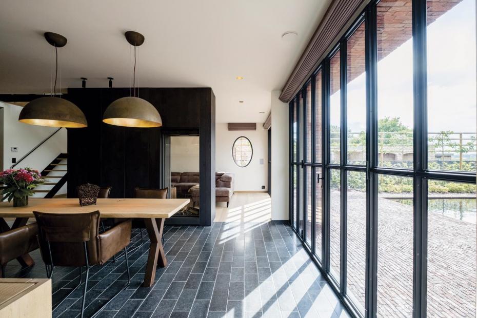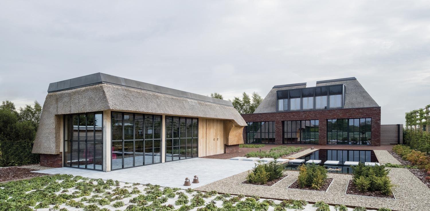 Das Schilfdach des Haupt- und Nebengebäudes ist nicht das einzige Highlight auf dem Grundstück am Rand einer kleinen, flämischen Gemeinde in Belgien: Im Garten findet sich darüber hinaus ein Naturpool mit Zierteich. Der Innenbereich des Haupthauses zeichnet sich durch Offenheit aus, die durch maßgefertigte Schränke, Füllwände oder Schiebetüren strukturiert wird. Um eine behagliche Wohnatmosphäre zu erschaffen, finden bevorzugt Naturstein, Stahl und helles Eichenholz Verwendung. Dynamisch ergänzt wird das Ensemble durch schwarze Stahlelemente, etwa die Treppe, die den weitläufigen Wohn- und Essbereich mit dem ersten Stock verbindet.