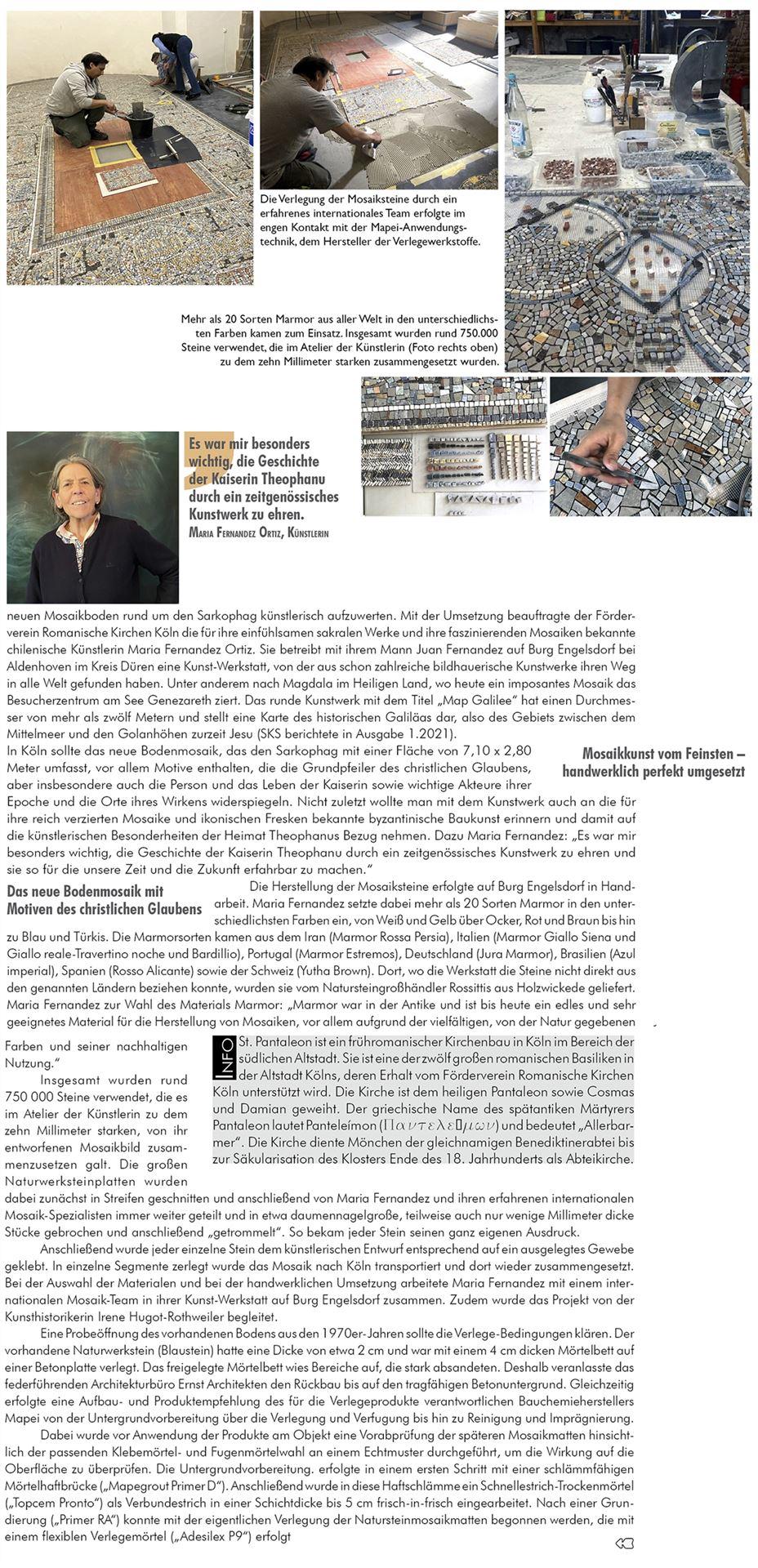 In Köln wurden diese Verlegeprodukte eingesetzt: Adesilex P9 (Flexverlegemörtel), „Ultracolor plus“ (Verfugung), Säurereiniger „Ultracare Keranet easy“ gegen Schleierrückstände auf der Belagsoberfläche, „Ultracare stain protector W plus“ für eine leichtere Reinigung (alle Mapei GmbH, https://www.mapei.com/de/de-de/)
