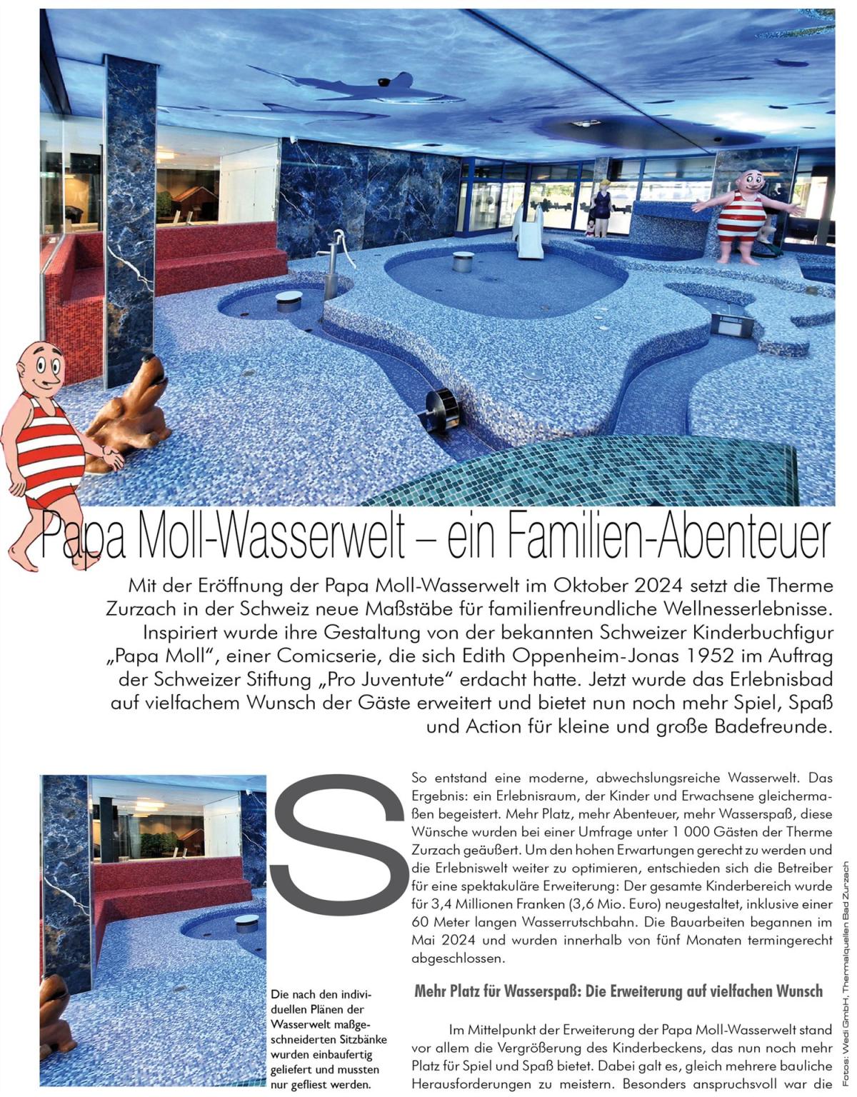 Über die Therme: https://www.thermezurzach.ch/therme/bad/papa-moll-wasserwelt. Geplant wurde die Erweiterung vom der Fit & Wellness Concept GmbH (https://www.fitundwellnessconcept.ch/fit-wellness-concept/). Papa Moll spielt nicht nur im Schwimmbad mit, sondern auch an Land, dem „Papa Moll Land“ (https://www.papamoll-land.ch/geschichte/)