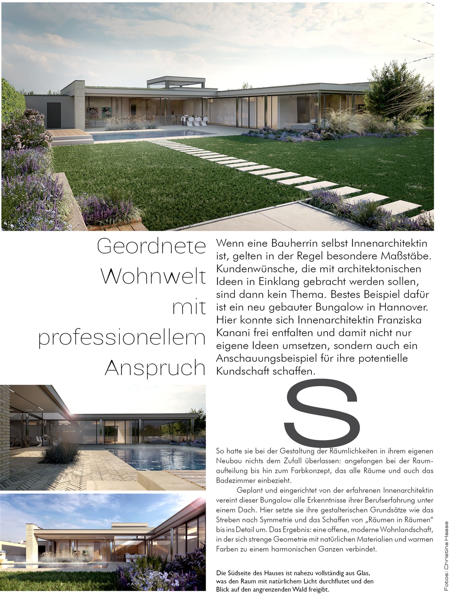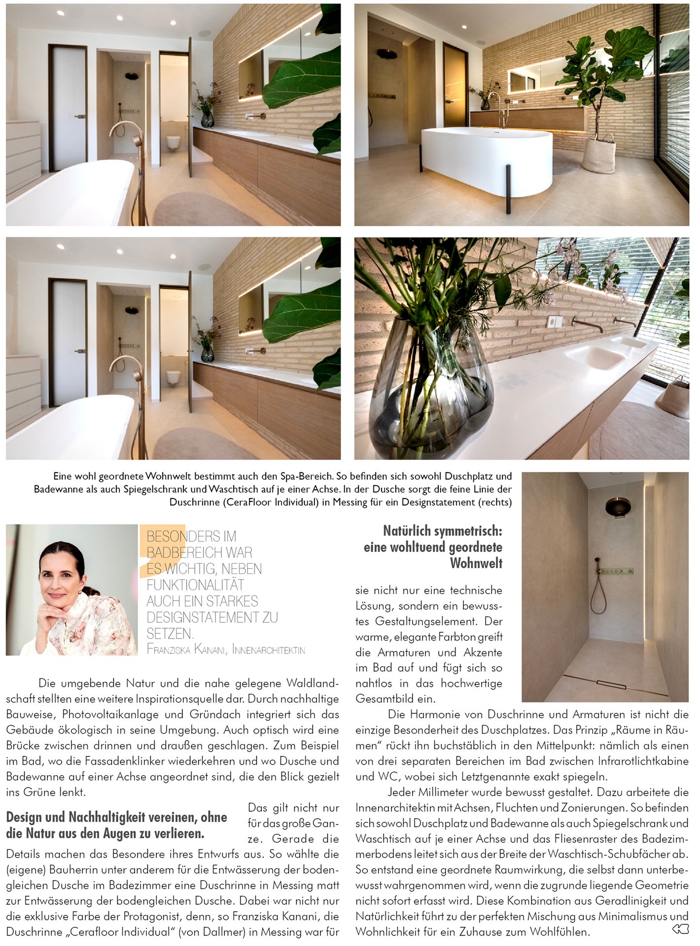Innenarchitektin Franziska Kanani hat für sich selbst ein Wohnhaus gebaut und dabei ihre ganz persönlichen Vorstellung realisiert. Kanani, deren Name im Hawaiianischen „die Schöne“ bedeutet, wie sie auf ihrer Internetseite (https://kanani.de/ueber-kanani-innenarchitektur/) verrät, hat sich auf Kernsanierungen und Grundrissoptimierungen spezialisiert, in denen sie ihre Expertise und Leidenschaft für Raumgestaltung voll ausspielt. Das soll auch ihr privaten Wohnprojekt demonstrieren. Besonderen Wert hat sie dabei auch die Gestaltung der Bäder gelegt. So war unter anderem die Duschrinne „Cerafloor Individual“ in Messing für sie nicht nur eine technische Lösung, sondern ein bewusstes Gestaltungselement.