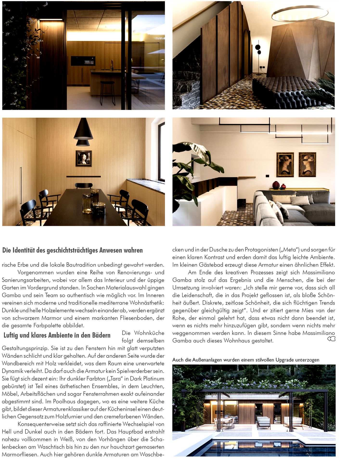 In dem pittoreske Dorf Valeggio sul Mincio (Verona) am Ufer des Flusses Mincio, haben Architekt Massimiliano Gamba und sein Team (https://www.massimilianogamba.it/) ein denkmalgeschütztes Wohnhaus behutsam saniert und neugestaltet. Armaturen von Dornbracht komplettieren das bis ins kleinste Detail durchdachte Projekt. Das Architekturbüro wurde 1998 als experimentelles Studio für Projekte aller Größenordnungen gegründet, von der Architektur bis zum industriellen Objektdesign, mit offensichtlich poetischen Konnotationen. Massimiliano Gamba über seine Ideale: „Wir sind kreative Menschen und wir machen kreative Dinge. Wir haben den Kopf in den Wolken und die Füße im Schlamm. Wir sind Architekten, Designer, Techniker und Künstler“. Protagonist im Sanitärbereich war unter anderem die Armatur „Meta in Dark Platinum gebürstet“