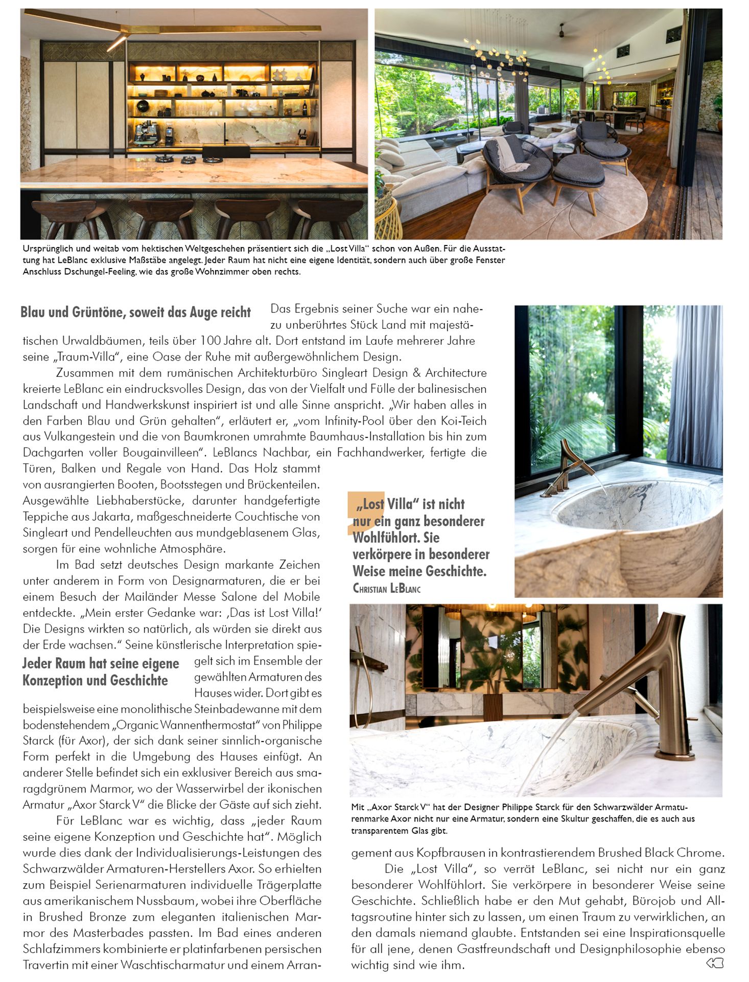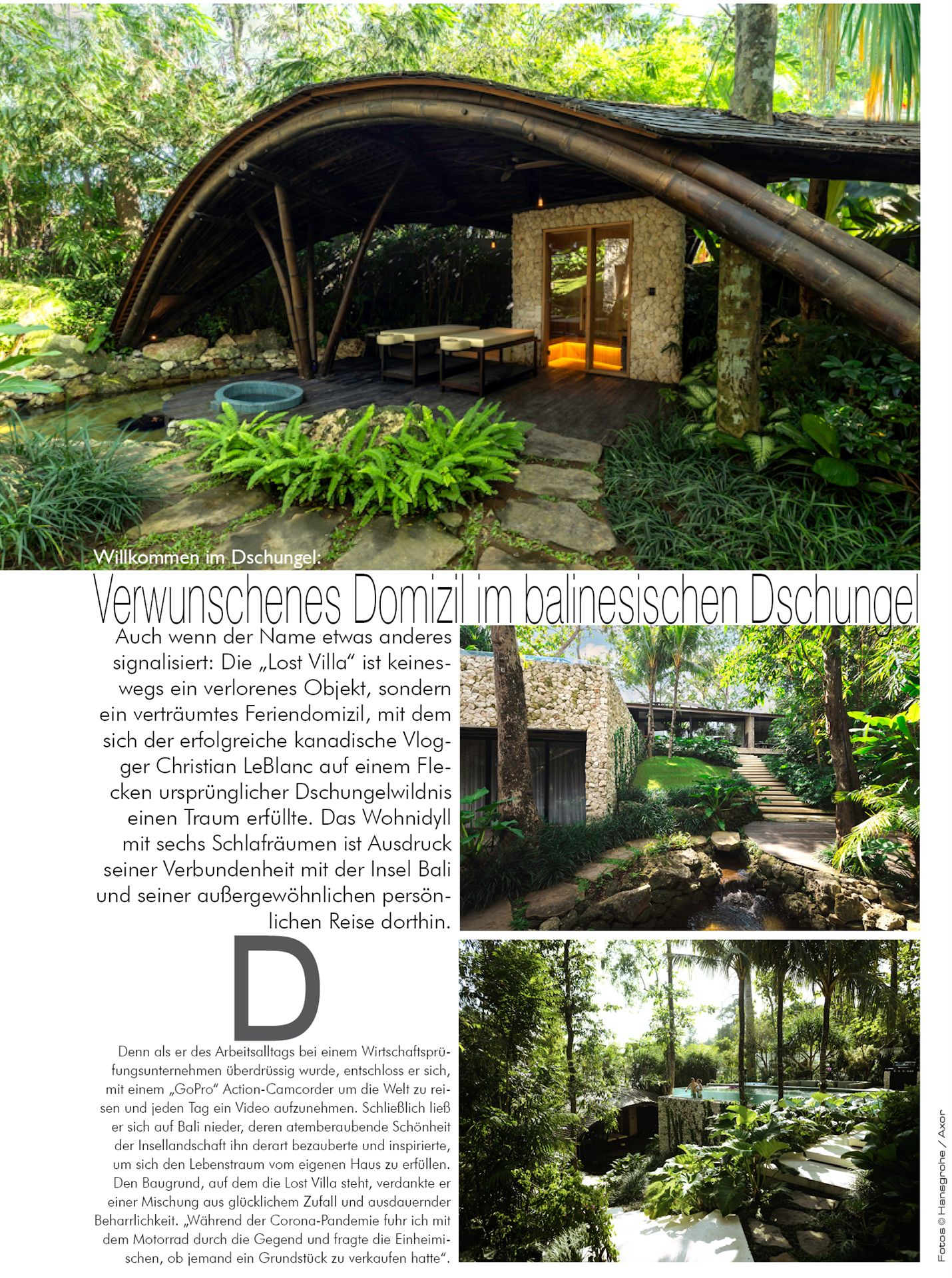 Der Vlogger Christian LeBlanc ist in allen Social Media Kanälen aktiv. Bei „Youtube“ hat er zum Beispiel 2,2 Millionen Follower. Seine Lost Villa bietet nicht nur Dschungel-Feeling, sondern gilt auch als beliebte Location für Urlaubaufenthalte oder Events: https://www.lostvillabali.com/. Unter dieser Adresse gibt es auch zahlreiche weitere Fotos der Anlage. Zu den Sponsoren, mit deren Hilfe LeBlanc seine Villa realisierte, gehört auch die Designmarke „Axor“ des Sanitärherstellers Hansgrohe. Hier war besonders Philippe Starcks Armaturen-Skulptur „Axor Starck V“ gefragt (https://www.axor-design.com/de/bad/produkte/kollektionen/axor-starck-v), aber auch der Individualisierung-Service des Herstellers „Axormyedition“: https://www.axor-design.com/de/bad/produkte/kollektionen/axor-myedition