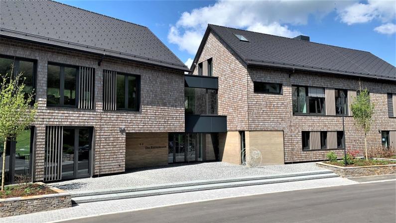 Der neue Dreigiebelbau präsentiert sich moderner und lichter als sein Vorgängerbau, ohne auf den regionalen Bezug ganz zu verzichten. Dafür sorgen beispielsweise graue, vorpatinierte Schindeln aus heimischen Hölzern als schwarzwaldtypische Verkleidung der Fassade. Im Inneren erwartet die Gäste künftig auf über 420 Quadratmetern wieder die kulinarische Vielfalt des Hotels mit drei Restaurants.