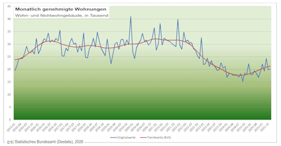 Eigentlich ist es ja eine gute Nachricht. Nach der Genehmigungsmisere des Jahres 2024, als im Jahresverlauf so wenige Baugenehmigungen erteilt wurden wie seit 2010 nicht mehr, ist die Zahl der Genehmigungen von Wohnungen im Jahr 2025 zwar nicht sprunghaft, aber im Zeitraum von Januar bis November immerhin um 11,3 Prozent gestiegen, verglichen mit den erstem 11 Monaten des Vorjahres. In konkreten Zahlen: ein Plus von 21 900 Wohnungen auf insgesamt 215 500. Diese Zahlen hat jetzt das Statistische Bundesamt in Wiesbaden veröffentlicht.