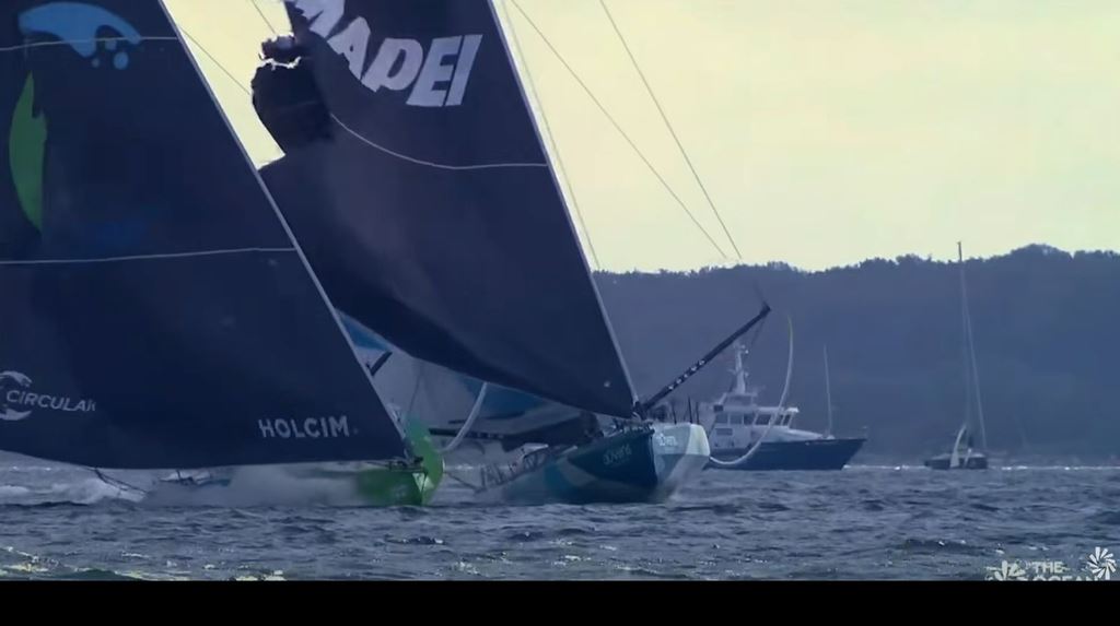 Und sie konnten dem Start entgegenfiebern, der bei solchen Regatten oft spektakuläre Momente bietet. Doch die Anspannung war bereits schnell zerrissen, vor allem aber das Vorsegel des IMOCA-Bootes, mit dem das „Allagrande Mapei Racing Team“ zum Sieg segeln wollte. Bereits wenige Minuten nach dem Start kollidierte das Schweizer Team Holcim – PRB mit den Italienern. Personen kamen zum Glück nicht zu Schaden. So führte für beide Teams die erste Etappe, die nach Portsmouth (GB) führte, erst einmal in die Werkstatt. Inzwischen ist alles repariert und beide Teams griffen in Portsmouth wieder ins Regatta-Geschehen ein.