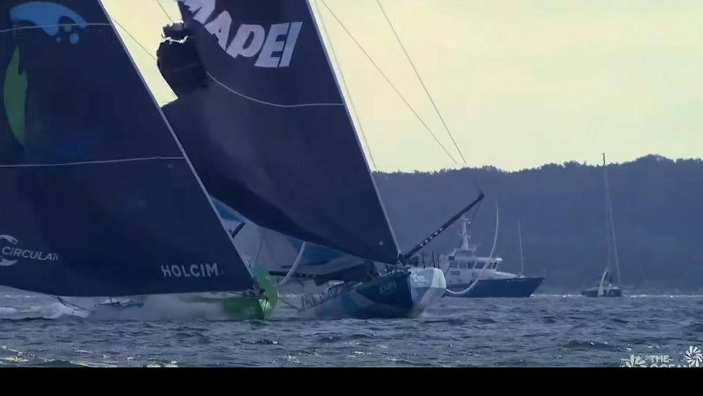 Laut dem NDR-Segel-Experten Tim Kröger hat Holcim die Kontrolle über das Boot verloren. Der Kiel war wohl nicht korrekt ausgerichtet und die Segel möglicherweise zu groß für den Wind, was dazu führte, dass das Boot in den Wind drehte und Allagrande Mapei von hinten hineinfuhr. Holcim erlitt schwere Schäden an der Bordwand, in die ein Ausleger des Mastes eindrang, wie auf NDR.de berichtet wird. Bei Allagrande Mapei wurden das Vor- und Großsegel zerfetzt und eingerissen. (Fotoquelle: Youtube)