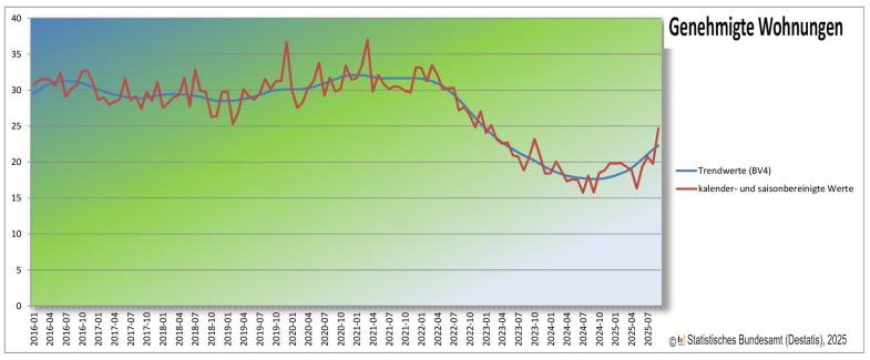 Die Zahl der genehmigten Wohnungen im Neubau sei im September 2025 gegenüber September 2024 um 80,1 Prozent, verlautet aus dem Statistischen Bundesamt. Allerdings sei demgegenüber die Zahl genehmigter Wohnungen, die durch den Umbau bestehender Gebäude entstehen, im Berichtsmonat gegenüber dem Vorjahresmonat um 4,9 Prozent gesunken. Auch bezogen auf den Zeitraum von Januar bis September 2025 gab es positive Zahlen: So wurden in Deutschland der Bau von 175 600 Wohnungen in neuen sowie bereits bestehenden Gebäuden genehmigt, 11,7 Prozent mehr als von Januar bis September 2024.