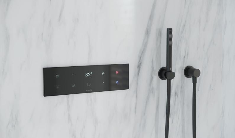 Jetzt lehnt sich der Armaturenhersteller Kludi mit Duschsteuerungen für Highend-Anwendungen aus dem digitalen Fenster, die für ein smartes Duscherlebnis sorgen sollen. Mit zwei Varianten: Eine für Nerds, eine weitere für Normalverbraucher. Wobei letztere für eben diese Nerds weniger interessant sein dürfte, weil sie aussieht wie eine analoge Duschsteuerung. Sie dürfte insbesondere für Anlagen mit wechselndem Publikum geeignet sein, und solche, die lieber ohne Handbuch unter der Dusche verweilen wollen. Der Variante „Pushtronic“ sieht man ihr digitales Innenleben nicht an. Denn hier erfolgt die Bedienung über komplett in der Metallplatte versenkbare, ergonomisch geformte Drück- und Drehknöpfe. Um das Wasser getrennt für zwei Verbraucher wie etwa Hand- und Kopfbrause an- und auszuschalten, genügt ein Druck auf den jeweiligen Knopf. Ein dritter Knopf reguliert die Temperatur. Alles gekennzeichnet mit (analog) aufgedruckten, gut lesbaren Symbolen gekennzeichnet. Nach dem Duschen verschwinden die Knöpfe bündig ist der flachen Metallplatte, was Reinigungs-Freaks erfreuen dürfte.