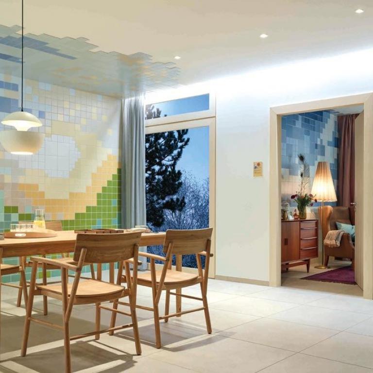 Agnes Tröger-Morguet (vom Büro Agnes Morguet Innenarchitektur & Design aus Köln) wollte mit ihren Konzept „Stay Unique“ das schöpferische Potenzial von Fliesen für das Seniorenwohnen einzusetzen, um Geschichten zu erzählen, Themenwelten zu schaffen oder Bereiche differenziert zu zonieren, ob Flure, Speise-Säle, Apartments, Aufenthaltsräume oder Badezimmer. Ornamente, Bilder, Motive und exakt definierte Farbflächen erlauben Einrichtungen für die ältere Generation, die anregend oder beruhigend gestaltbar sind, ermöglicht durch eine großzügige Farb- und Formatpalette und dem daraus resultierenden Pixel-Katalog, der immer wieder neu kreativ arrangiert werden kann.