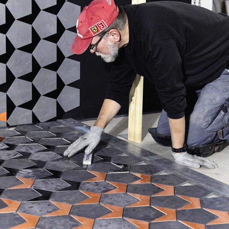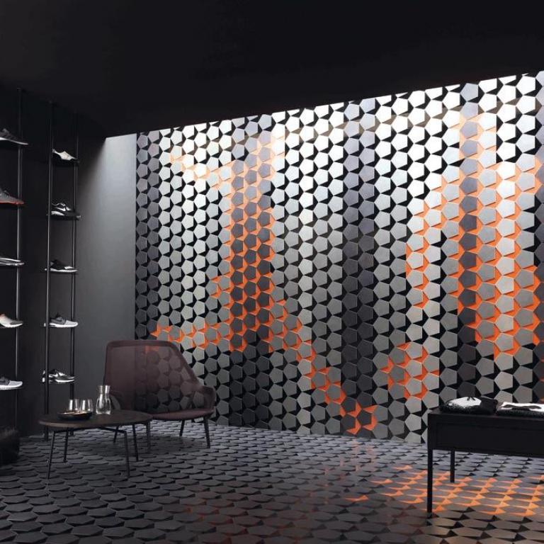 Bei dem Entwurf „RE:Tile“ von Andreas Crynen (Ingenhoven Architects, Mönchengladbach) wird mit einem Muster aus zweidimensionalen Fliesen ein dreidimensionaler Effekt erzeugt. Das Konzept überzeugt durch Einfachheit: Die Komposition aus wenigen unterschiedlichen Varianten eröffnet mannigfaltige Möglichkeiten im Bereich Interior Design, z.B. im Ladenbau. Graue und schwarze Fliesen bilden den idealen Rahmen für markantes Orange. Das Ergebnis sind keramische Wand- und Bodenbeläge, die plastisch-lebendig wirken und durch die haptische Anmutung von Fliesen einen spürbaren Mehrwert bieten im Vergleich zu einer rein grafischen Umsetzung.
