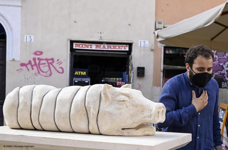 Im wahrsten Sinne Stein des Anstoßes ist eine künstlerische Installation auf einem Platz im römischen Lokal-Viertel Trastevere in Rom: eine Spanferkel aus Kalkstein, geschaffen von dem Künstler Amedeo Longo im Auftrag des RUFA-Instituts, der Kunst-Universität in Rom. Wer die italienische Küche kennt, kennt auch „Porchetta“, Schweinefleisch mit Kräuterfüllung, im Ofen geröstet, als eine typisch römische Spezialität, die von Lokalen in Trastevere angeboten wird. Longo wollte offensichtlich diesem typischen italienischen Gericht ein Denkmal setzen, was dem Tierschutz-Verband LAV (Lega Anti Vivisezione) allerdings überhaupt nicht schmeckte.